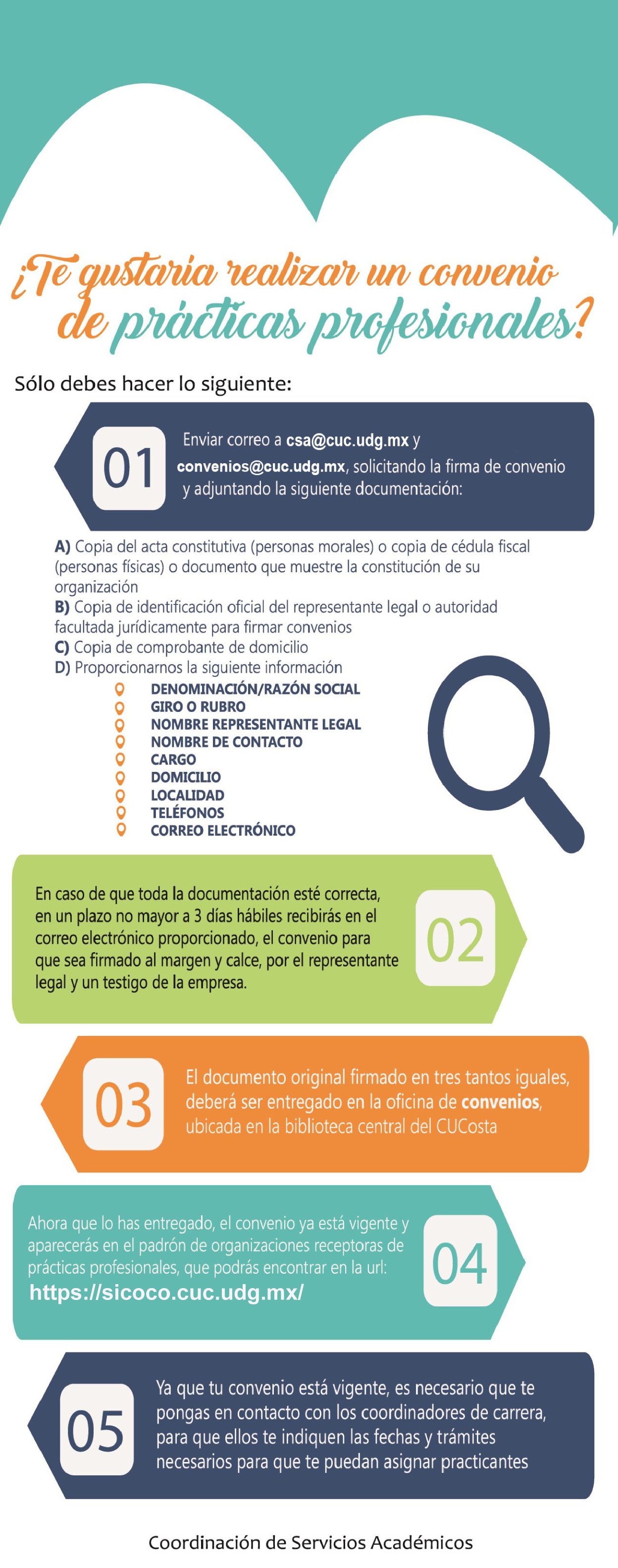Las prácticas profesionales se encuentran normadas por un convenio el cual estipula los derechos y obligaciones de cada una de las partes (CUCosta, Empresa y Estudiante). Dicho convenio se firmará por la empresa en cuestión y por el Rector del Centro Universitario. Si su empresa está interesada en promover un convenio de prácticas profesionales este es el procedimiento a seguir: